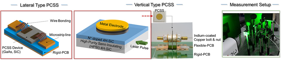 A photoconductive semiconductor switch (PCSS) is optoelectronic device, which have unique advantages including ultrafast switching, reliable operation, and negligible jitter time. Moreover, solid state microwave generation using PCSS is available for the miniaturization by the device scaling. MIDAS group investigates the switching characteristics and high power operations reaching the limitations of semi-insulating III-V semiconductor(GaAs/SiC)-based photoconductive semiconductor switches for the industry of pulsed power applications.